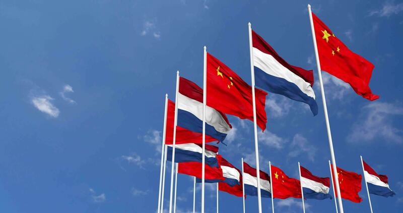 Netherlands and China Flags Waving Together in the Sky, Seamless Loop in Wind, Space on Left Side for Design or Information, 3D Rendering Free Video