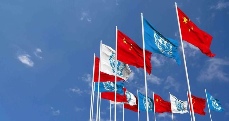 China and United Nations, UN Flags Waving Together in the Sky, Seamless Loop in Wind, Space on Left Side for Design or Information, 3D Rendering