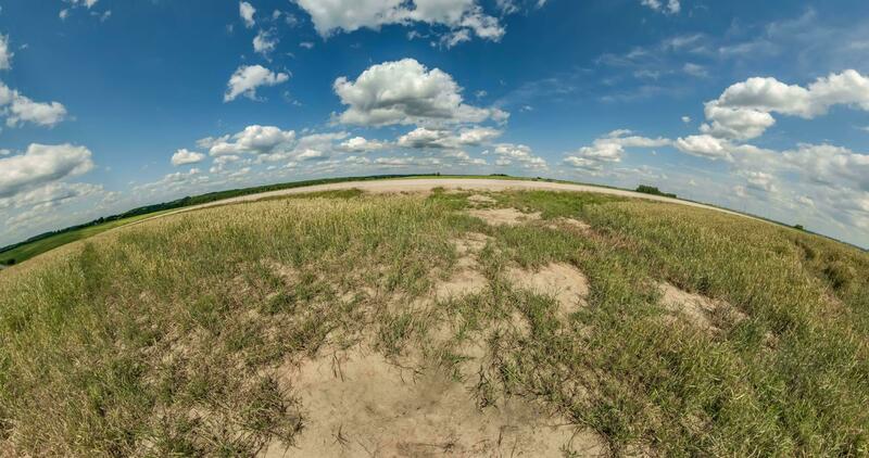 green little planet loop transformation with curvature of space among fields in sunny day and beautiful clouds Pro Video