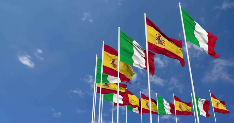 Spain and Italy Flags Waving Together in the Sky, Seamless Loop in Wind, Space on Left Side for Design or Information, 3D Rendering Free Video