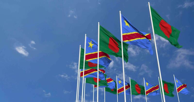 DR Congo and Bangladesh Flags Waving Together in the Sky, Seamless Loop in Wind, Space on Left Side for Design or Information, 3D Rendering Free Video