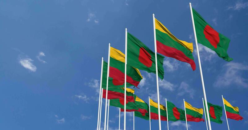 Lithuania and Bangladesh Flags Waving Together in the Sky, Seamless Loop in Wind, Space on Left Side for Design or Information, 3D Rendering Free Video