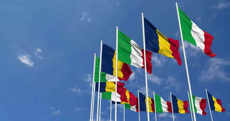 Chad and Italy Flags Waving Together in the Sky, Seamless Loop in Wind, Space on Left Side for Design or Information, 3D Rendering Free Video