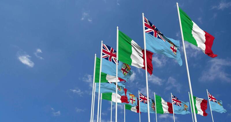 Fiji and Italy Flags Waving Together in the Sky, Seamless Loop in Wind, Space on Left Side for Design or Information, 3D Rendering Free Video