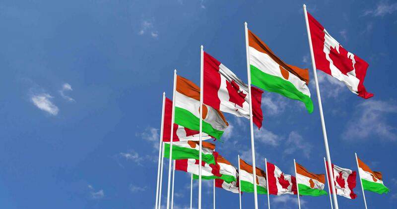 Niger and Canada Flags Waving Together in the Sky, Seamless Loop in Wind, Space on Left Side for Design or Information, 3D Rendering Free Video