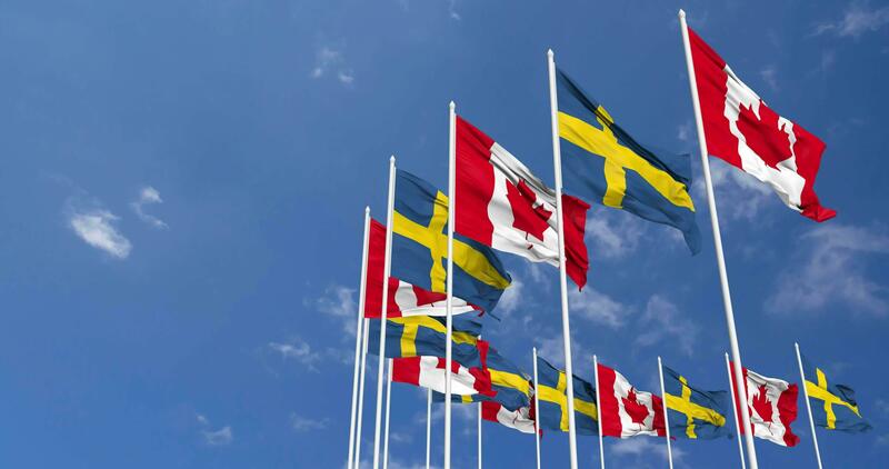 Sweden and Canada Flags Waving Together in the Sky, Seamless Loop in Wind, Space on Left Side for Design or Information, 3D Rendering Free Video