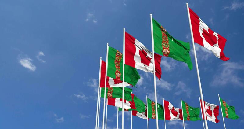 Turkmenistan and Canada Flags Waving Together in the Sky, Seamless Loop in Wind, Space on Left Side for Design or Information, 3D Rendering Free Video