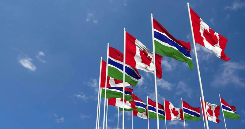 Gambia and Canada Flags Waving Together in the Sky, Seamless Loop in Wind, Space on Left Side for Design or Information, 3D Rendering Free Video