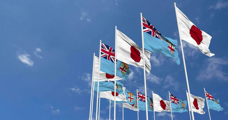 Fiji and Japan Flags Waving Together in the Sky, Seamless Loop in Wind, Space on Left Side for Design or Information, 3D Rendering Free Video