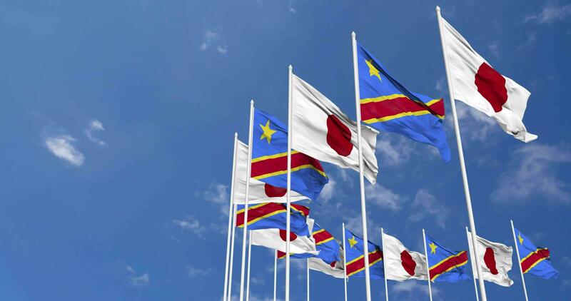 DR Congo and Japan Flags Waving Together in the Sky, Seamless Loop in Wind, Space on Left Side for Design or Information, 3D Rendering Free Video
