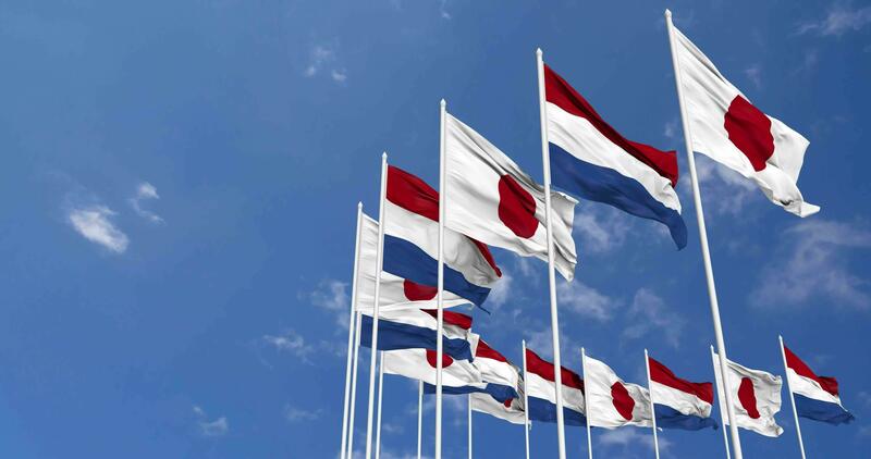 Netherlands and Japan Flags Waving Together in the Sky, Seamless Loop in Wind, Space on Left Side for Design or Information, 3D Rendering Free Video