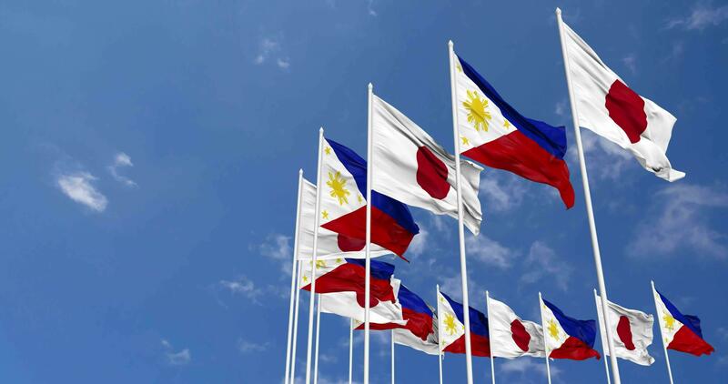 Philippines and Japan Flags Waving Together in the Sky, Seamless Loop in Wind, Space on Left Side for Design or Information, 3D Rendering Free Video