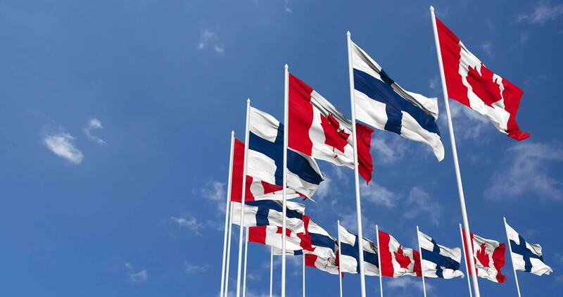 Finland and Canada Flags Waving Together in the Sky, Seamless Loop in Wind, Space on Left Side for Design or Information, 3D Rendering Free Video