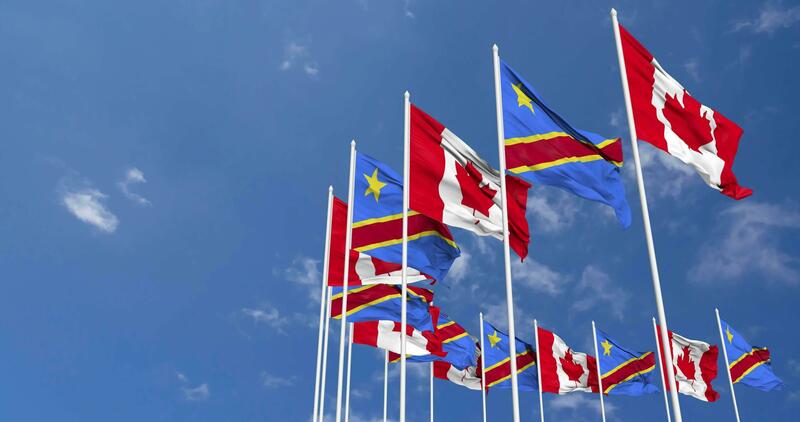 DR Congo and Canada Flags Waving Together in the Sky, Seamless Loop in Wind, Space on Left Side for Design or Information, 3D Rendering Free Video