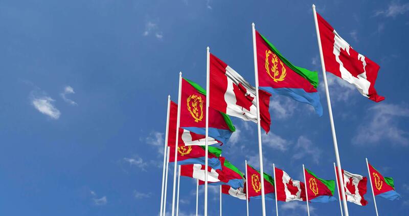 Eritrea and Canada Flags Waving Together in the Sky, Seamless Loop in Wind, Space on Left Side for Design or Information, 3D Rendering Free Video