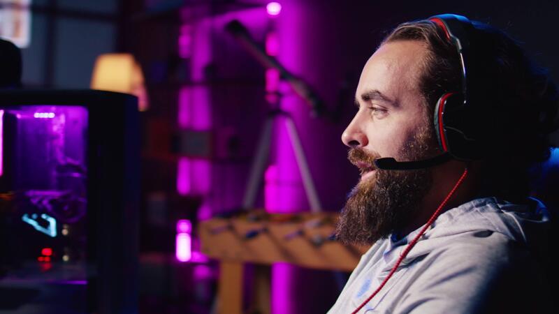 Man discussing with friends online while playing singleplayer videogame with spaceship shooting at asteroids, panning shot. Close up of gamer chatting with teammates in SF game using headphones mic Pro Video