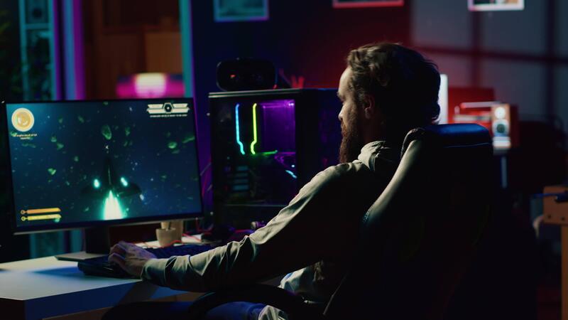 Man playing spaceship flying singleplayer game with overlay HUD showing health, fuel, ammo bars and minimap. Gamer navigating with spacecraft in galaxy, shooting at asteroids Pro Video