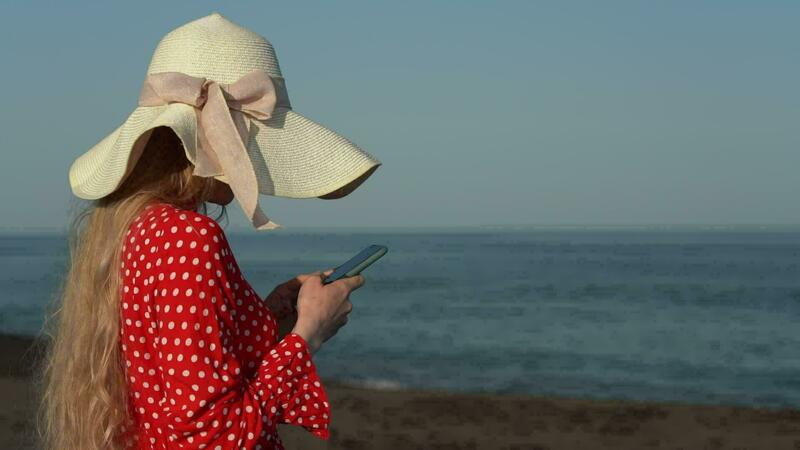 Woman using smartphone, reading and typing text messaging on beach on background of waves of sea Pro Video