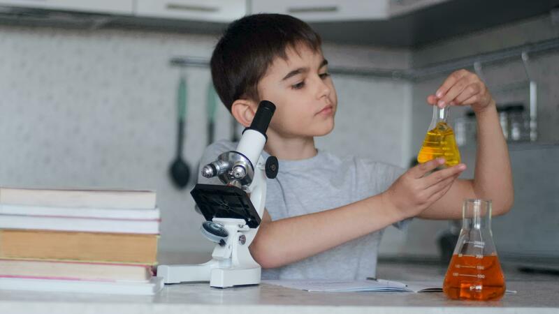 Close-up. Attractive Boy teaches chemistry using a microscope and flasks with liquid and makes notes in a notebook. Homework. Pro Video