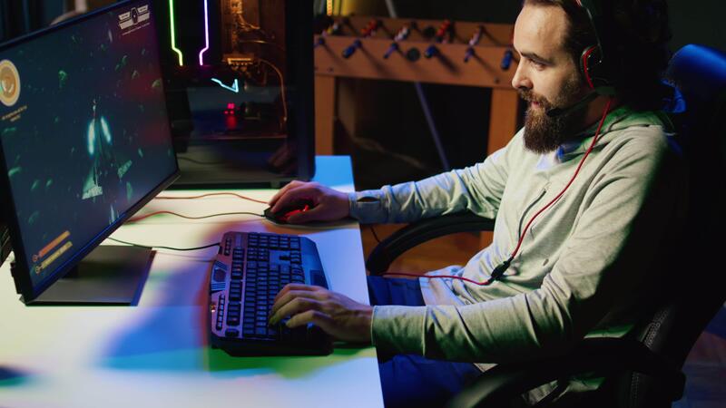 Man in neon lit apartment playing singleplayer videogame with spaceship shooting laser bullets at asteroids. Gamer using crosshair overlay to hit targets in science fiction arcade game, jib down shot Pro Video