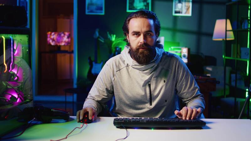 Man plays intense videogame tournament online during stream with audience, spamming attack buttons. Gamer participating in esports competition during livestream, pressing hard on keyboard keys Pro Video