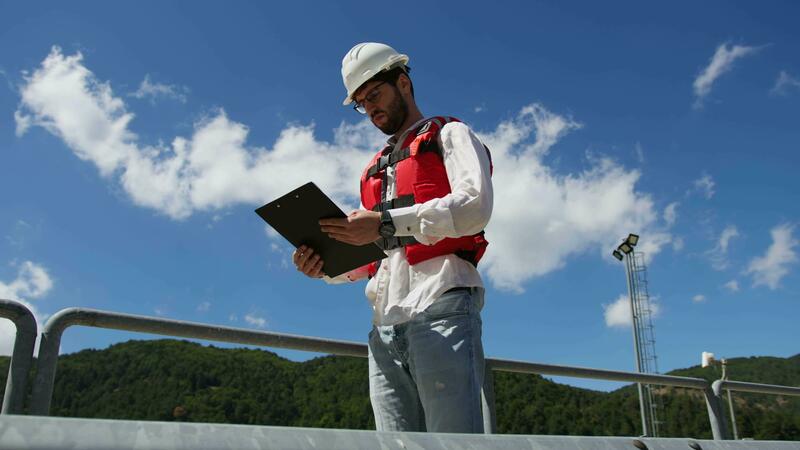 Man Construction manager with a notepad check the dam building on the mountains Pro Video