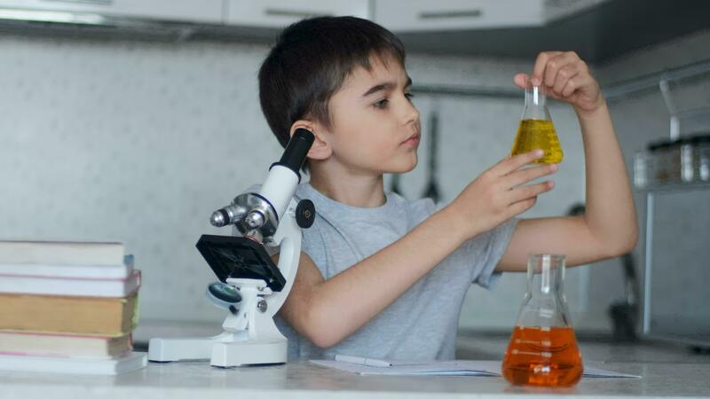 Close-up. An attractive schoolboy teaches chemistry using a microscope and flasks with liquid and makes notes in a notebook. Homework. Pro Video