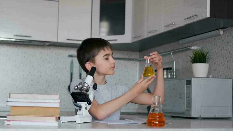 Attractive Boy teaches biology using a microscope and flasks with liquid and makes notes in a notebook. Homework. Pro Video
