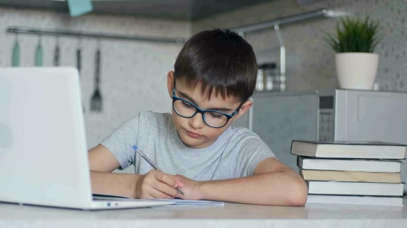 Attractive child in glasses teaches lessons while at home sitting in the kitchen at the table using a laptop, textbooks, notebook. Camera movement forward Pro Video