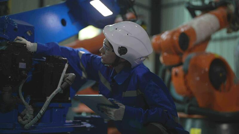 Factory engineer woman inspecting on machine with smart tablet. Worker works at machine robot arm. The welding machine with a remote system in an industrial factory. Artificial intelligence concept. Pro Video