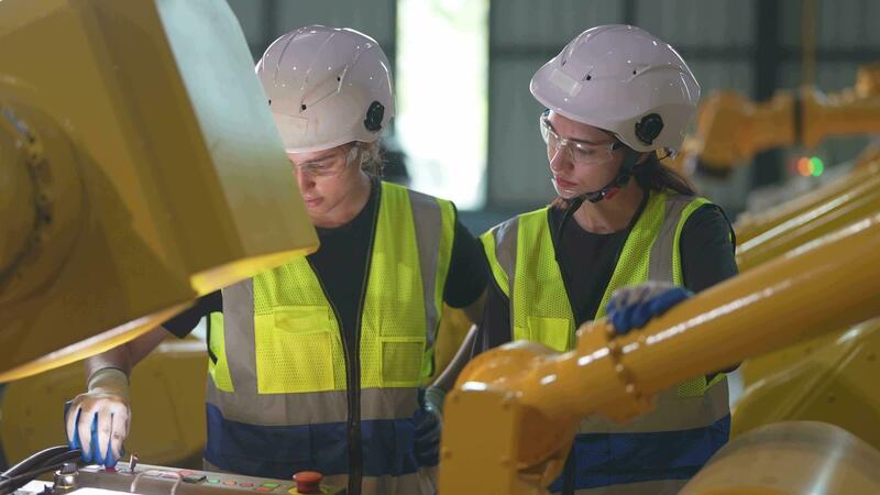 Factory engineer woman inspecting on machine with smart tablet. Worker works at machine robot arm. The welding machine with a remote system in an industrial factory. Artificial intelligence concept. Pro Video