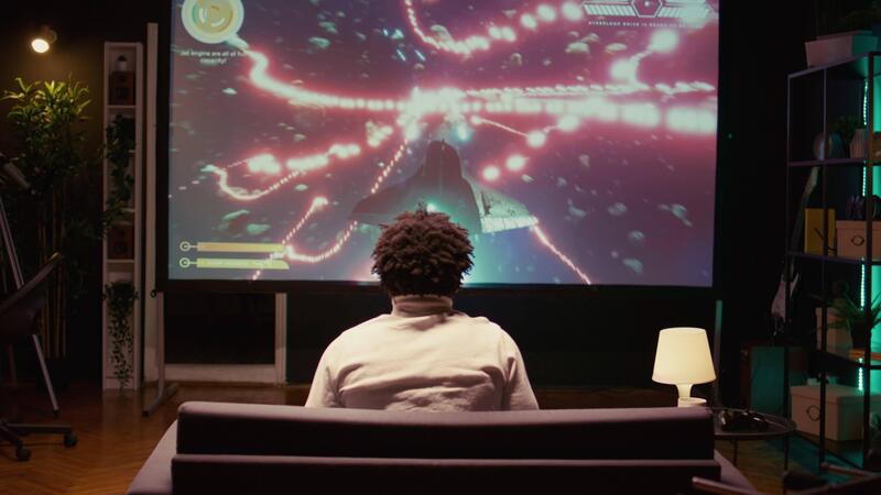 Gamer receiving game over screen, losing all health, failing to win level and beat enemies in spaceship flying game on TV. Player defeated in science fiction singleplayer videogame Pro Video
