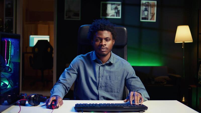 Man playing intense game on rgb lit computer desktop, spamming mouse and keyboard buttons to defeat enemies. Gamer in neon lit room focused on competitive videogame on PC Pro Video