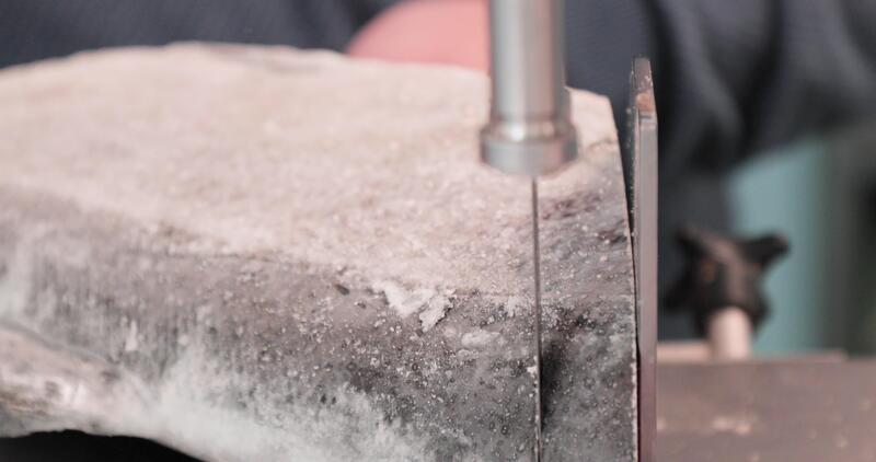 Close Up View Of Cutting Salmon Using Slicing Machine - slow motion Pro Video