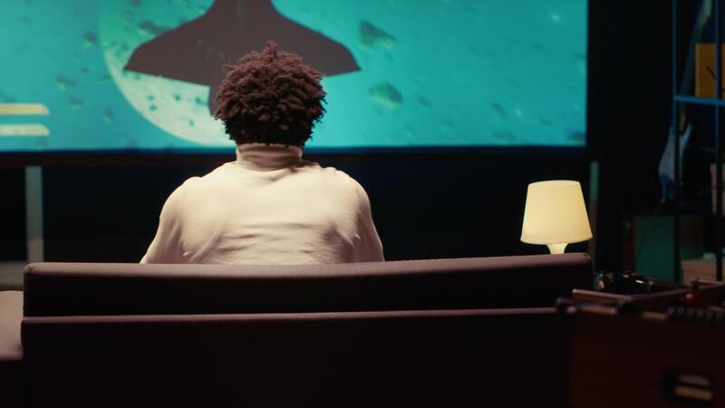 Gamer plays intense classic arcade space shooter videogame, shooting asteroids using spaceship laser beams. Man relaxing at home using high tech gaming system to solve missions in singleplayer game Pro Video