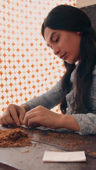 Focused craftsperson working on a project with tools on a wooden table, with a patterned backdrop Pro Video