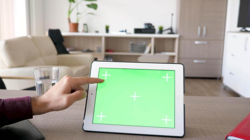 Man touching a digital tablet PC screen with chroma mock up on it. The gadget is on the table in comfy house. Free Video