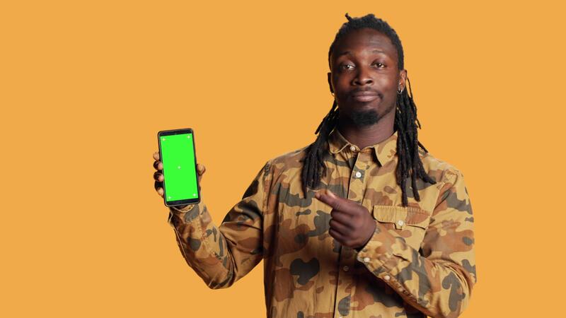 Smiling man points to smartphone with greenscreen on camera, showing blank mockup template on mobile device display. Young adult presenting isolated chromakey layout on phone screen. Free Video