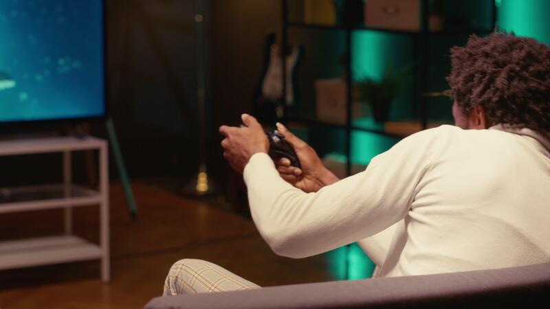 Man in rgb lit apartment using cloud gaming service to play demanding competitive multiplayer SF videogame on TV. Player streaming game online, using motion controlled controller gadget to play Free Video