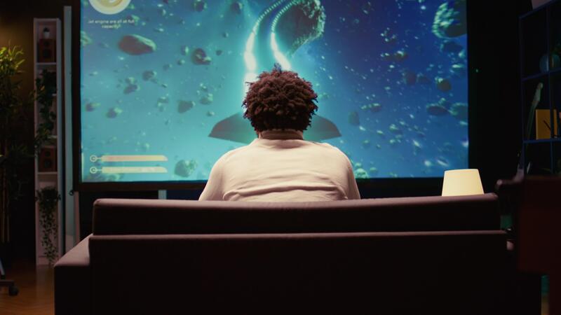 BIPOC man plays spaceship science fiction singleplayer game with overlay HUD showing health, fuel, ammo bars and minimap. Gamer enjoying high quality ray tracing graphics in videogame Free Video