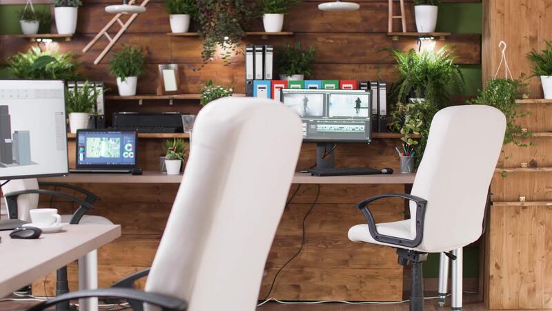 Dolly shot of media production office. Computers displaying 3D and editing software Pro Video