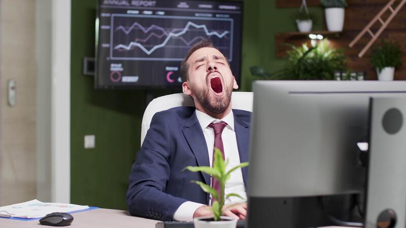 Businessman yawning while typing on the computer in modern office with big TV displaying sales data Pro Video