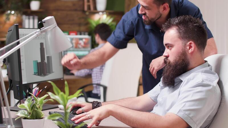 In creative media house two architects are talking about new project. They have a 3D software running a simulation Pro Video