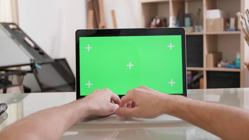 Man working in a artsy workshop in front of a green screen. Pov of typing at a laptop with green screen on. Pro Video