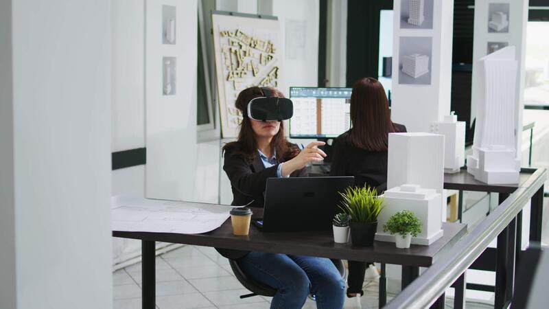 Woman architect working with vr glasses in startup office, modeling floor plan or house blueprint using metaverse artificial intelligence. Industrial engineer developing architectural lines. Pro Video