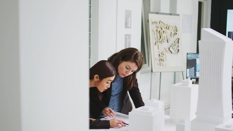 Two architects measuring building scale on blueprint, working together to create sketch of home layout. Team of developers drawing lines and elements on engineering drafts in agency office. Pro Video