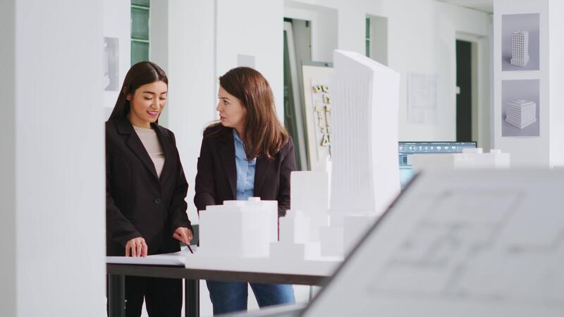 Designers give a high five after drafting objectives, satisfied with their efforts in converting dimensions and deciding scaling components for construction. Women finish assignments correctly. Pro Video