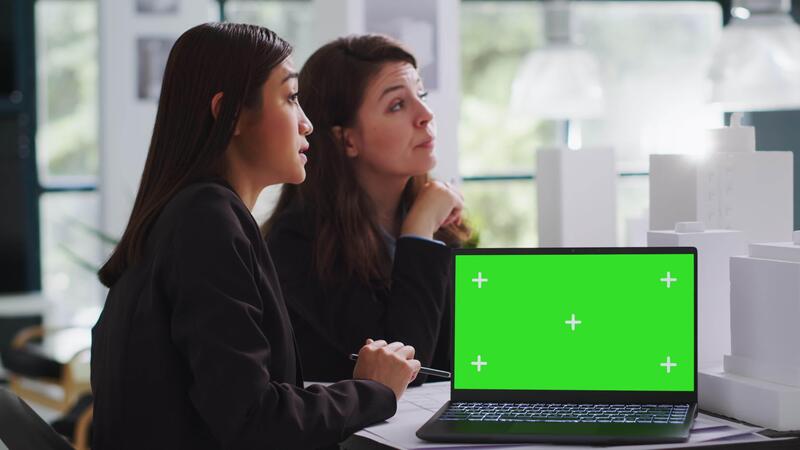 Team of engineers working with greenscreen display on pc, planning new building project with isolated copyspace layout on laptop. Architects using 3d building model and mockup chromakey. Pro Video