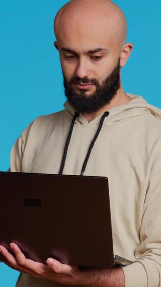 Vertical Video Middle eastern man works with cyber security on laptop, trying to do some software programming and report bugs. Young adult operating as a system developer in studio. Camera 2. Handheld shot. Pro Video