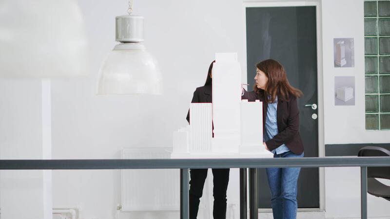 Experts measure models printed in 3D to determine proportions while working on unicorn business expansion goals. Women builders develop architectural blueprints using scale dimensions. Pro Video